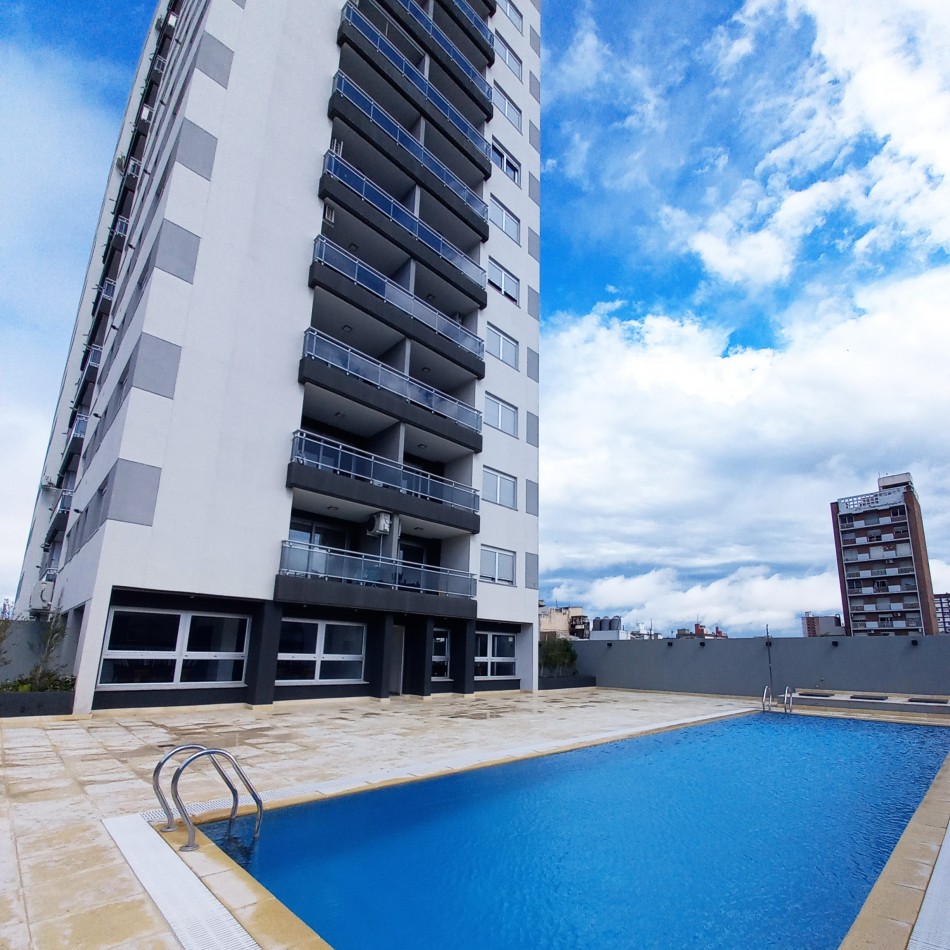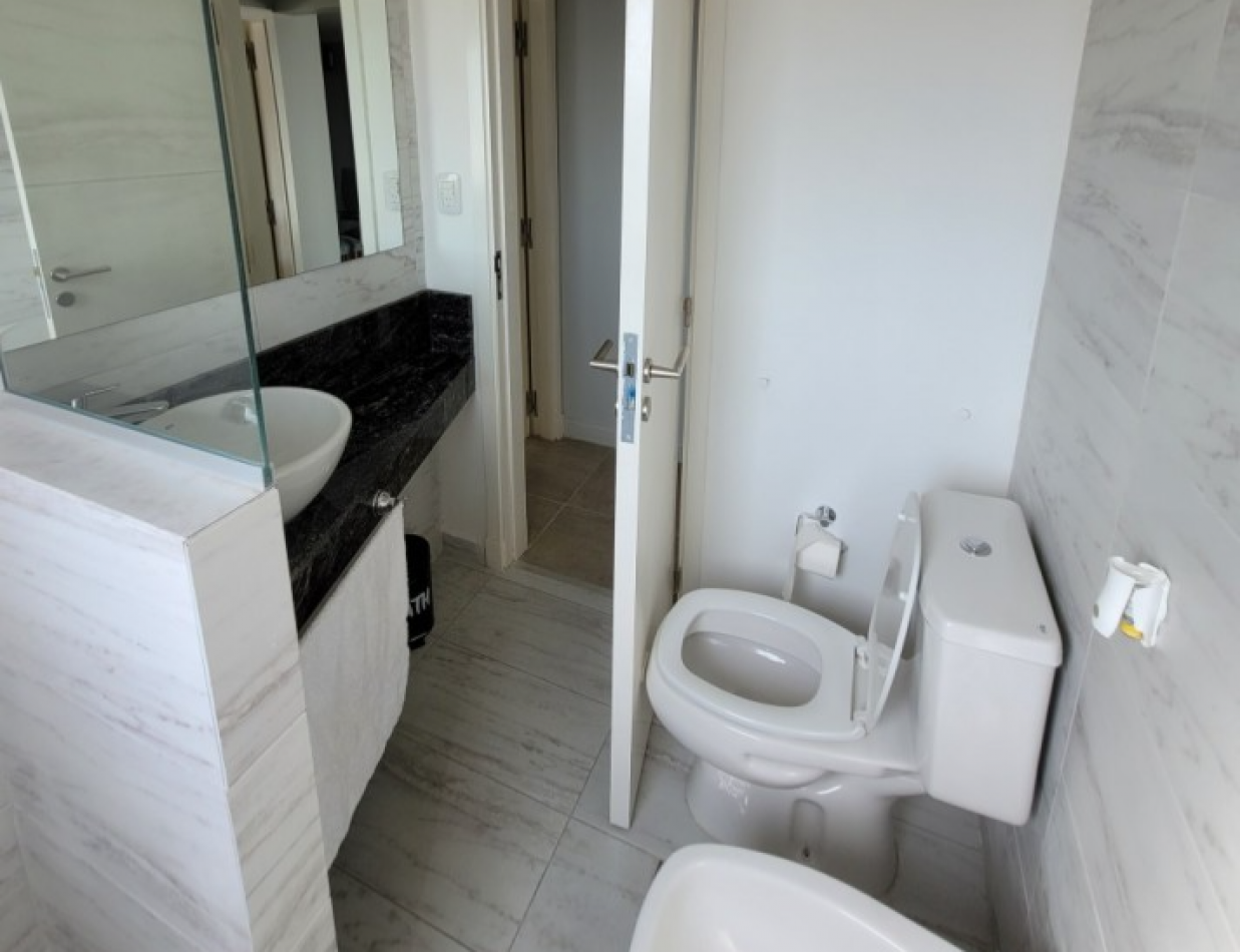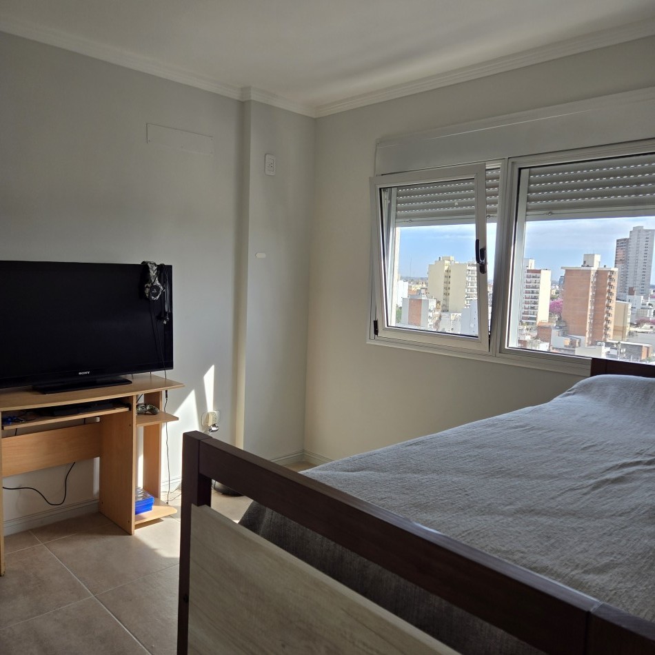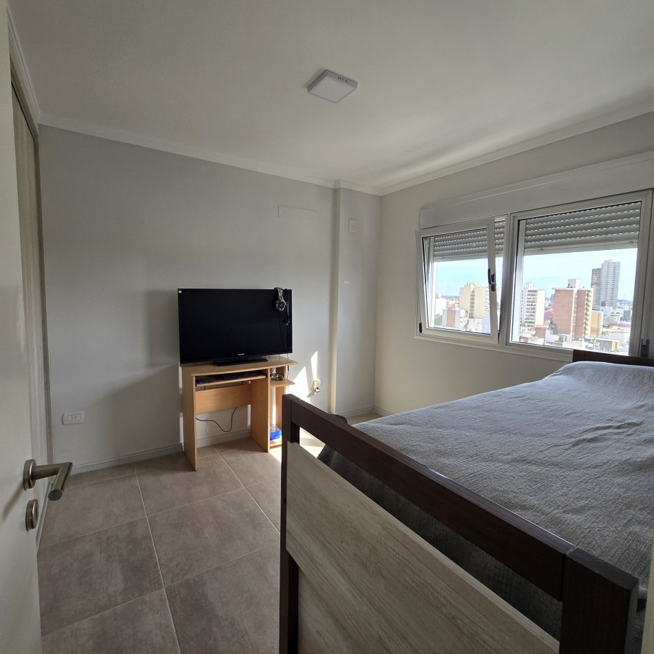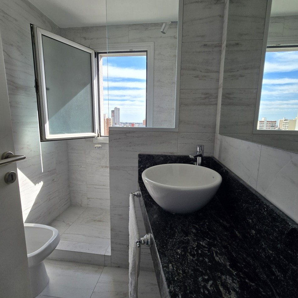 Dpto de categoría muy bien ubicado y muy luminoso. Consta de dos dormitorios (uno en suite) dos baños, cocina lavadero, amplio estar comedor, y un cómodo balcón. Cochera de fácil acceso. Se encuentra en piso alto al frente, con orientación noreste. Las terminaciones y los materiales del mismo son de excelente calidad, aberturas de aluminio de alta prestación, vidrios DVH, sistema de calefacción por radiadores, placares en ambos dormitorios, puerta de ingreso de seguridad, sistema de energía solar para el agua caliente. El edificio además cuenta con amenities, posee una gran pileta, dos SUM completos con asador y sanitarios, 3 ascensores y un imponente hall de ingreso. Listo para entrar a vivir. Posibilidad de vender amueblado.