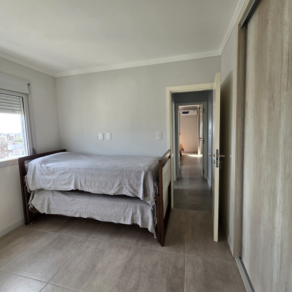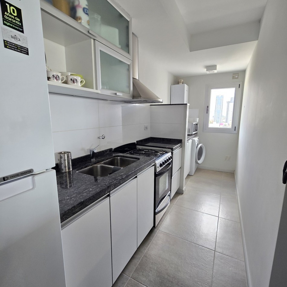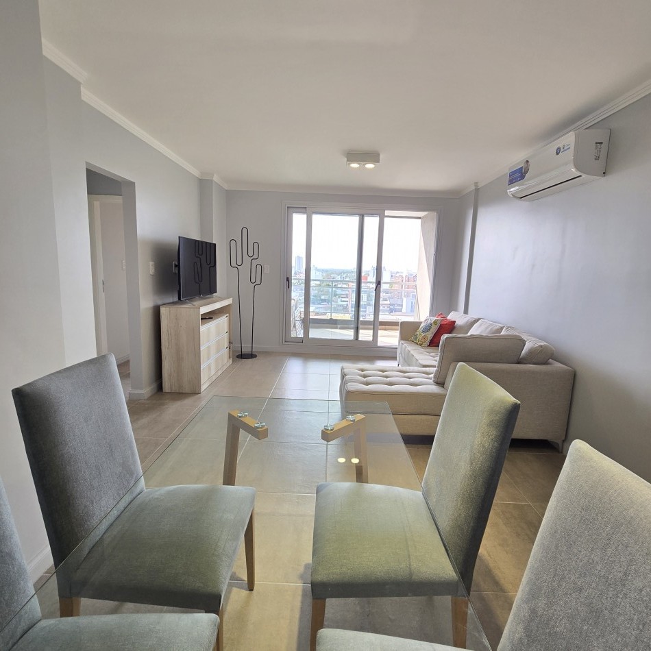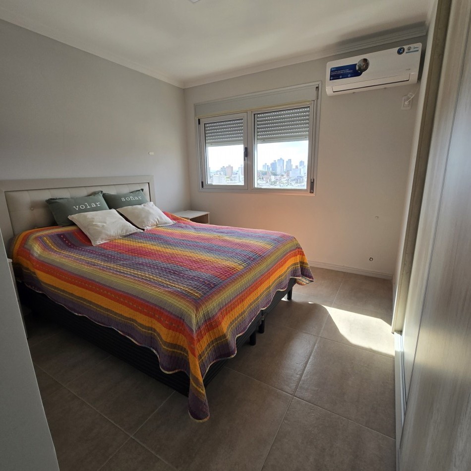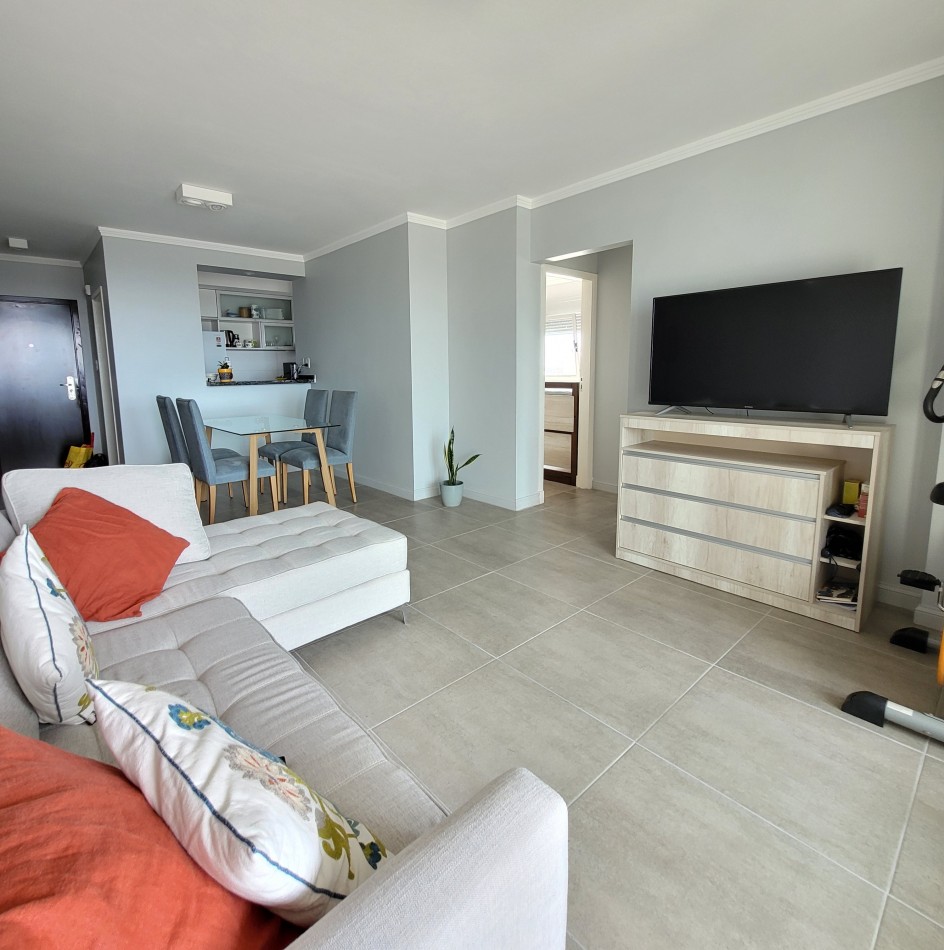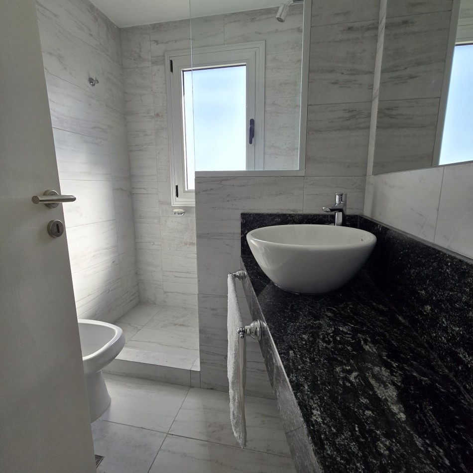 Dpto de categoría muy bien ubicado y muy luminoso. Consta de dos dormitorios (uno en suite) dos baños, cocina lavadero, amplio estar comedor, y un cómodo balcón. Cochera de fácil acceso. Se encuentra en piso alto al frente, con orientación noreste. Las terminaciones y los materiales del mismo son de excelente calidad, aberturas de aluminio de alta prestación, vidrios DVH, sistema de calefacción por radiadores, placares en ambos dormitorios, puerta de ingreso de seguridad, sistema de energía solar para el agua caliente. El edificio además cuenta con amenities, posee una gran pileta, dos SUM completos con asador y sanitarios, 3 ascensores y un imponente hall de ingreso. Listo para entrar a vivir. Posibilidad de vender amueblado.